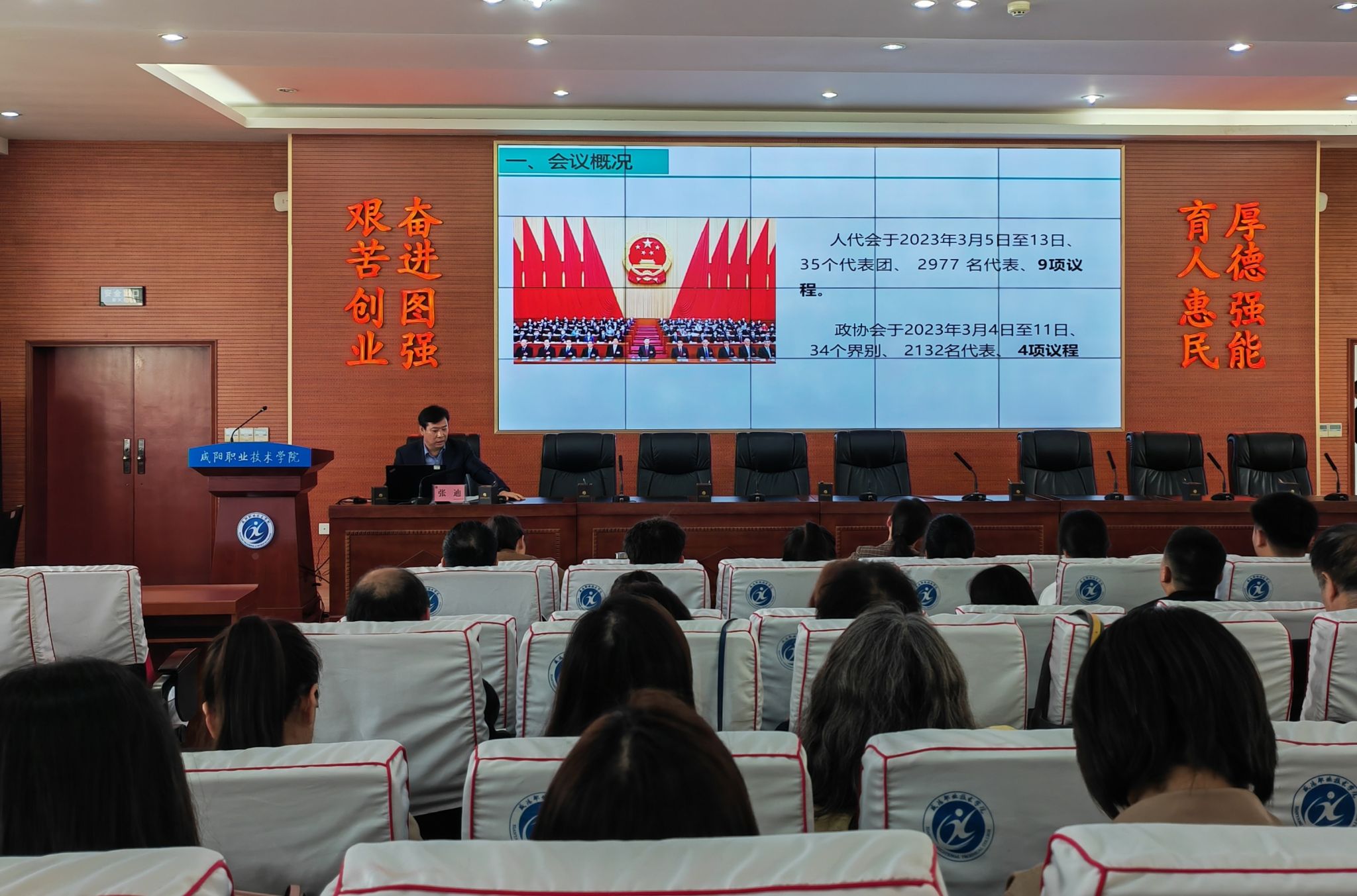 张迪首先从人代会和政协会的对比出发,围绕两个会议的代表团构成、人数、议程,为师生讲述了2023年全国”两会“的概况。接着分别从习近平总书记重要讲话精神,政府工作报告,全国人大常委会工作报告,立法法修正案,国务院机构改革等方面带领师生再次深刻领会了会议的精神实质。最后,张迪分别从教育、科技和人才三个方面和与会人员分享了自己的见解体会和学习感悟。