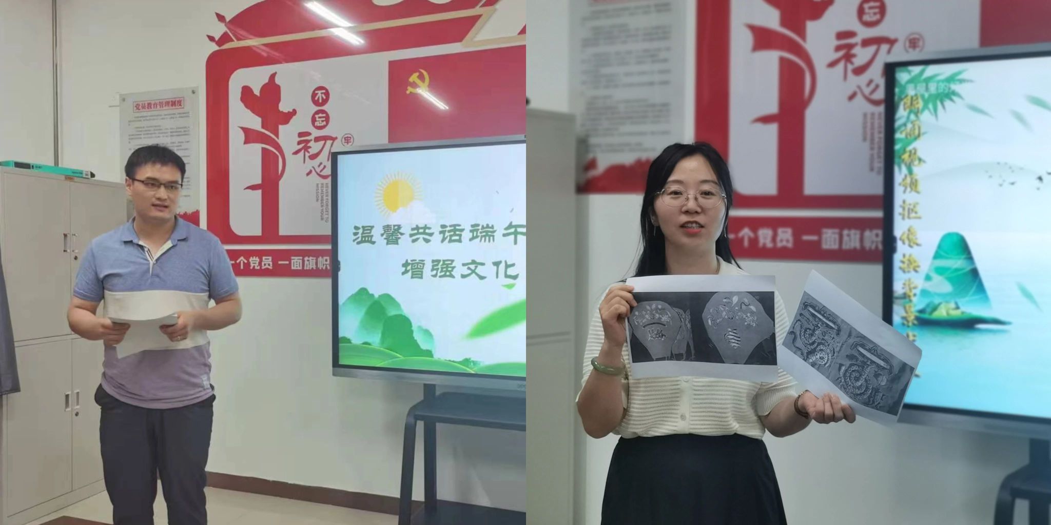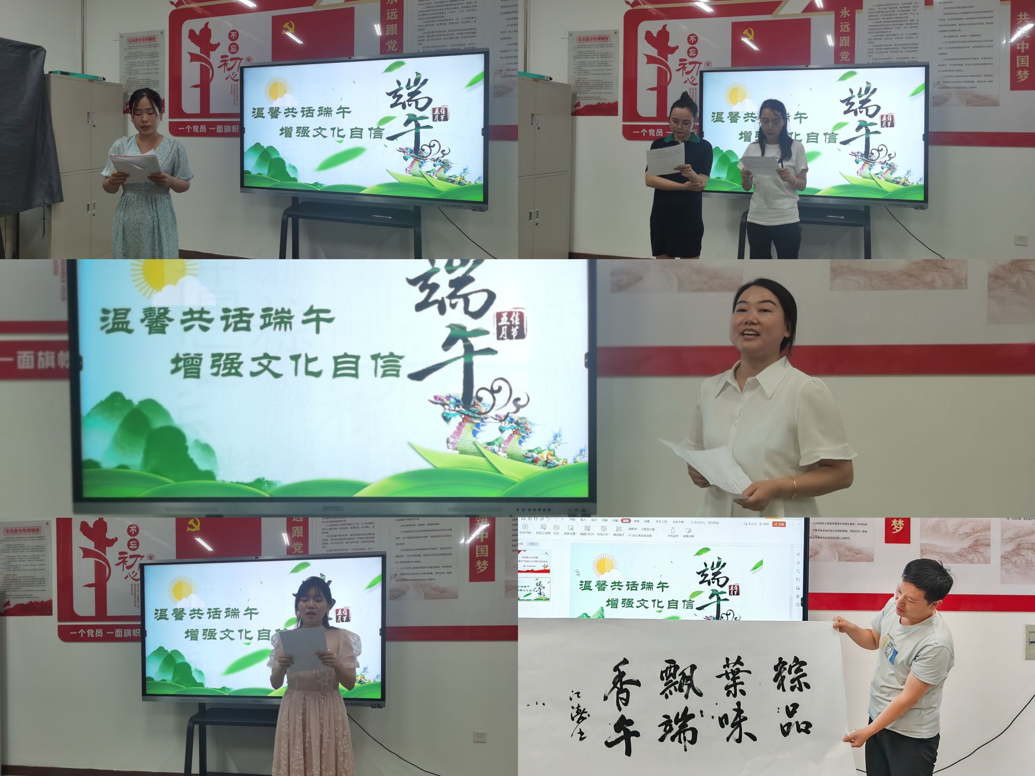 共展端午才艺环节,王昀乔老师为大家朗诵了屈原的《九章•橘颂》,李丹和赵蕊两位老师为大家带来《以梦为马》,张丽老师为大家带来一首陕北民歌,李申淼老师以《汨罗不灭的永恒》为题分享了伟大诗人屈原的一生经历,苏江涛老师现场书写了“粽叶飘香品味端午”为大家送上祝福。