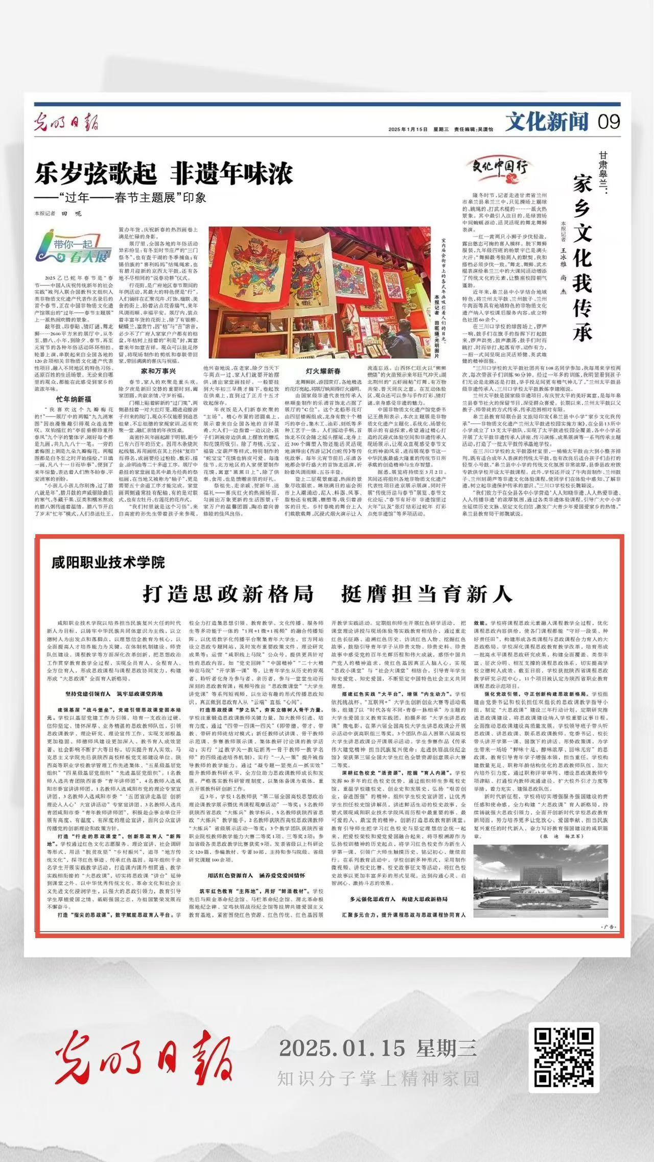 1月15日,《光明日报》第09版文化新闻刊发公司党委书记张迪、经理杨卫军署名文章《打造思政新格局 挺膺担当育新人》。文章介绍了咸阳职院以培养担当民族复兴大任的时代新人为目标,以铸牢中华民族共同体意识为主线,以立德树人为出发点和落脚点,以理想信念教育为核心,以全面提高人才培养能力为关键,在体制机制建设、团队队伍建设、课程教学等方面深化改革创新,全力构建“大思政课”育人新格局的经验做法和成效特色。现将全文转发如下: