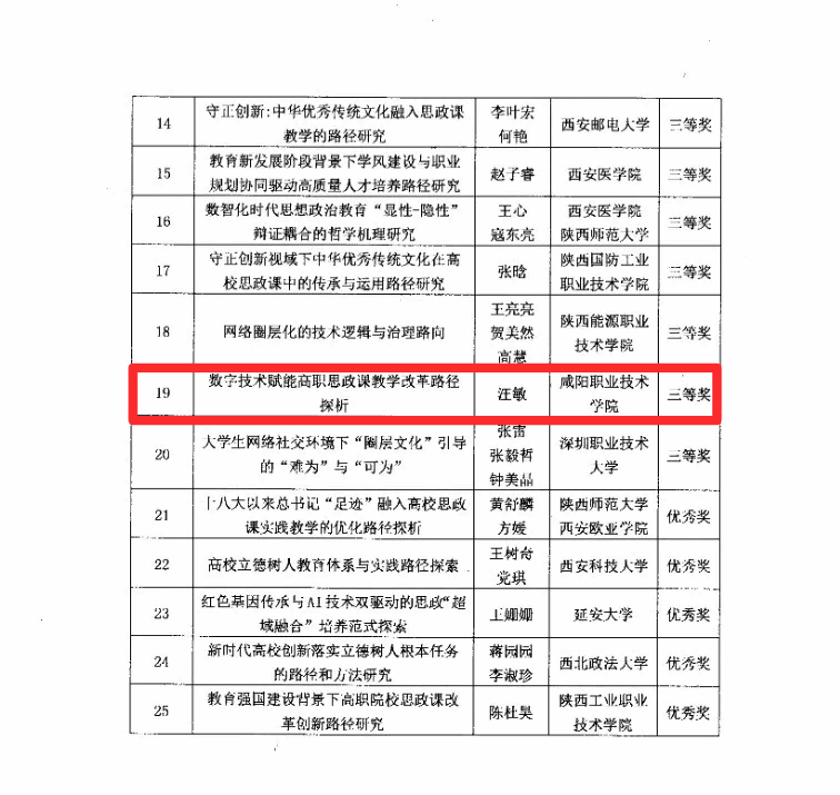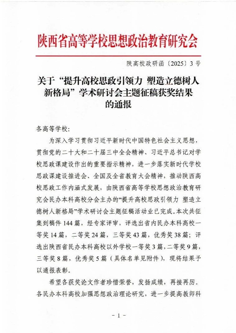 近日,由陕西省高等公司思想政治教育研究会民办本科高校分会主办的“提升高校思政引领力 塑造立德树人新格局”学术研讨会主题征稿活动已完成。本次共征集到稿件144篇,经专家评审,公司教师汪敏《数字技术赋能高职思政课教学改革路径探析》一文获学术研讨会论文三等奖。