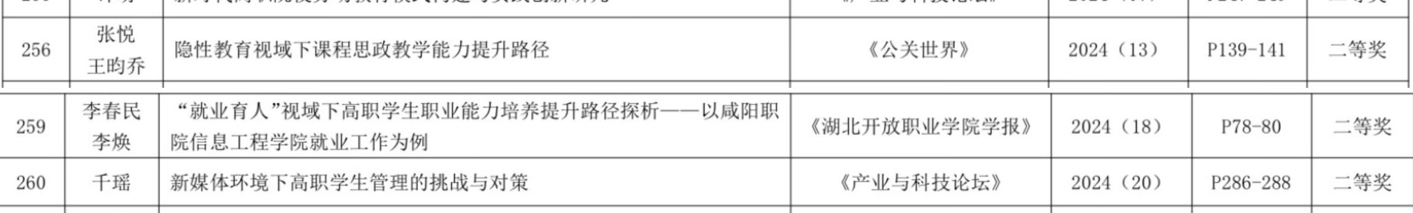 近日,陕西省职业技术教育学会2024年度优秀职教论文评选结果正式公布,咸阳职院best365共9篇论文获奖。其中李春民等三名老师的3篇论文获二等奖,帖兰等六名老师的6篇论文获三等奖。
