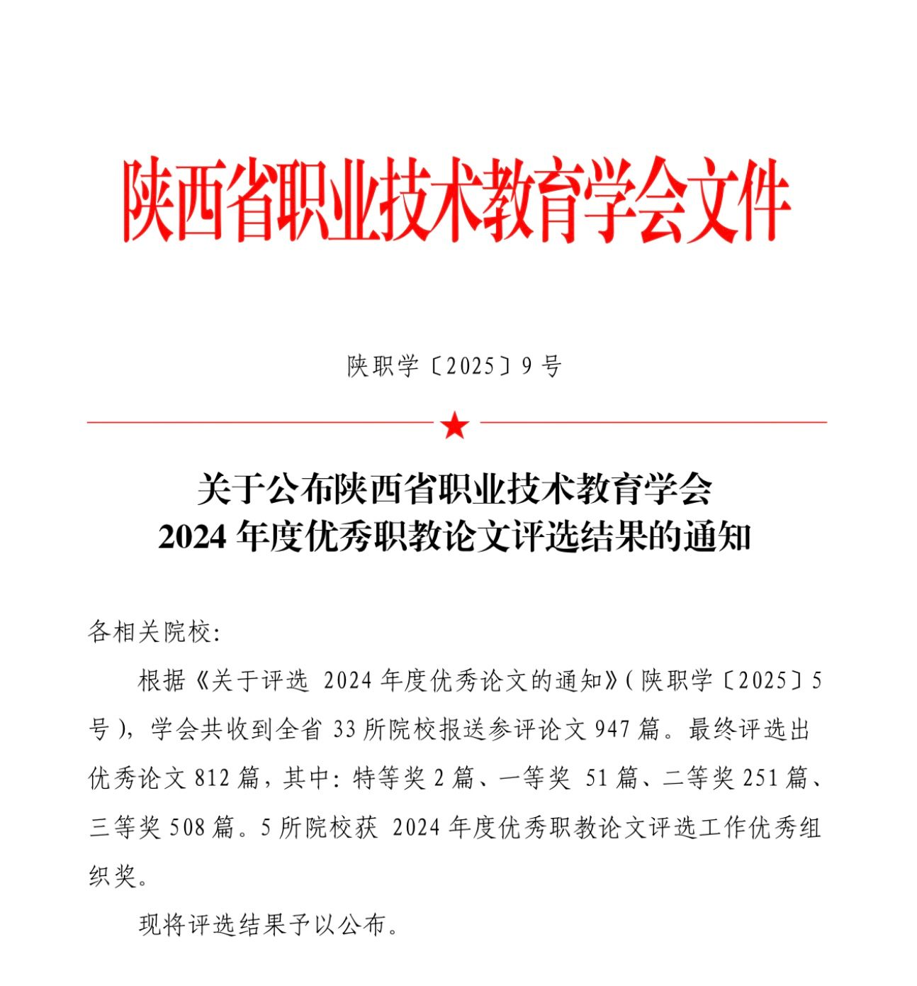 本次评选活动由陕西省职业技术教育学会组织开展,全省各高职院校广泛参与,论文内容主要围绕学习贯彻党的二十大精神、学习贯彻党的教育方针,落实立德树人根本任务等方面展开。