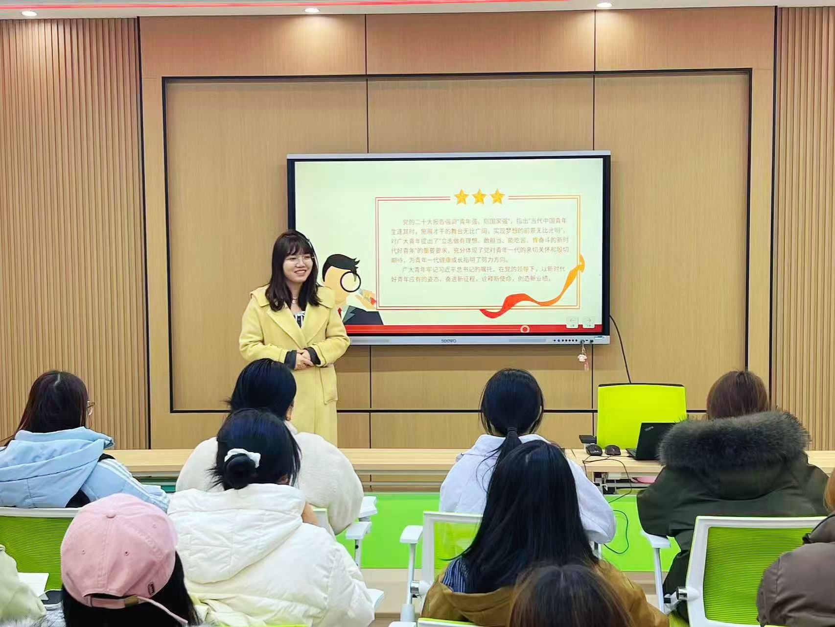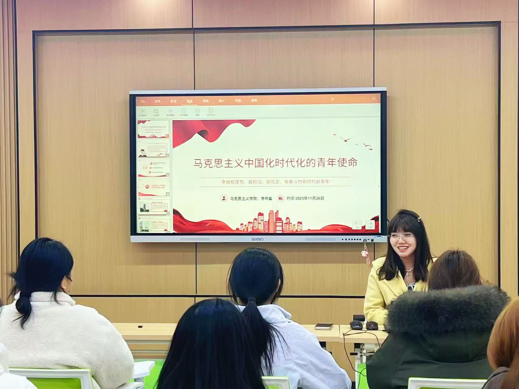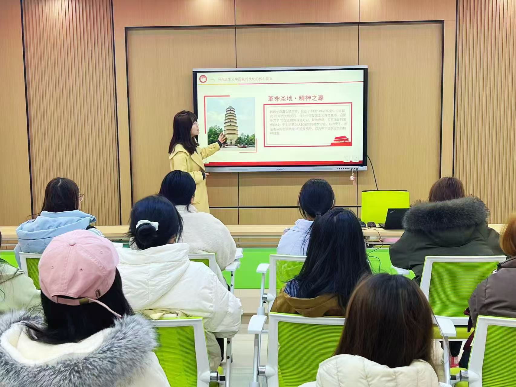 李申淼老师围绕马克思主义中国化时代化的核心内涵、当代青年的三大使命以及青年践行使命担当的行动路径三个维度展开讲授。她巧妙融入西迁精神等鲜活案例,以清晰透彻的理论阐释,搭配视频分享,让模范榜样走进员工视野,强调对于陕西的高职员工来说,就是要深深扎根三秦大地,以精湛技能为羽翼,以使命担当为灯塔,在陕西的高质量发展中,在制造业升级、乡村振兴、生态保护等领域,挥洒青春汗水、贡献青春力量。