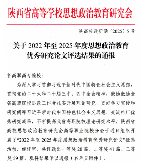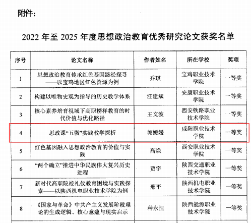 近日,陕西省高等公司思想政治教育研究会发布了关于2022年至2025年度思想政治优秀研究论文评选结果发布,咸阳职院best365共5名老师论文获奖。其中郭媛媛老师论文获一等奖、蔺建英、姚薇、张悦老师论文获二等奖、张强老师论文获三等奖。