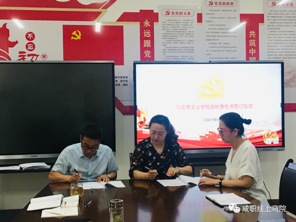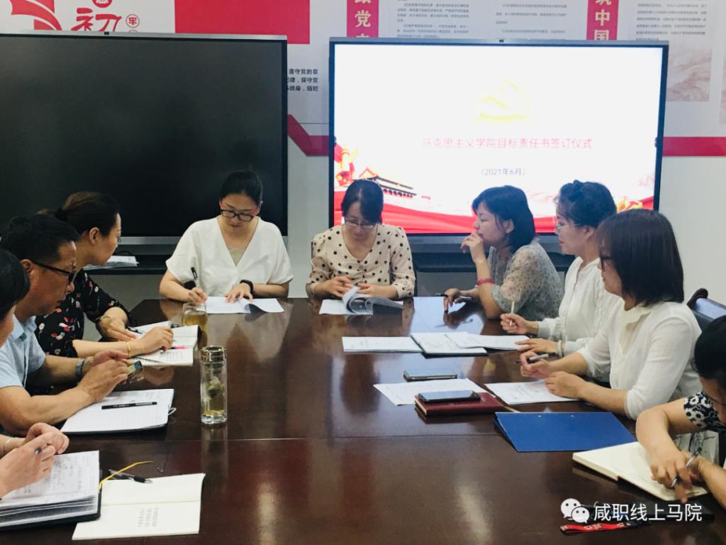 经理李信、党总支书记王小亚、副经理蔺建英与综合办主任梁鹏、教学办主任姚薇进行了职能部门年度质量绩效考核责任书签约。副经理蔺建英、教学办主任姚薇与概论教研室主任郭媛媛、思修教研室主任帖兰进行了年度教学任务质量绩效考核责任书签约。概论教研室主任郭媛媛、思修教研室主任帖兰与各教研室教师进行了年度教学任务质量绩效考核责任书签约。
