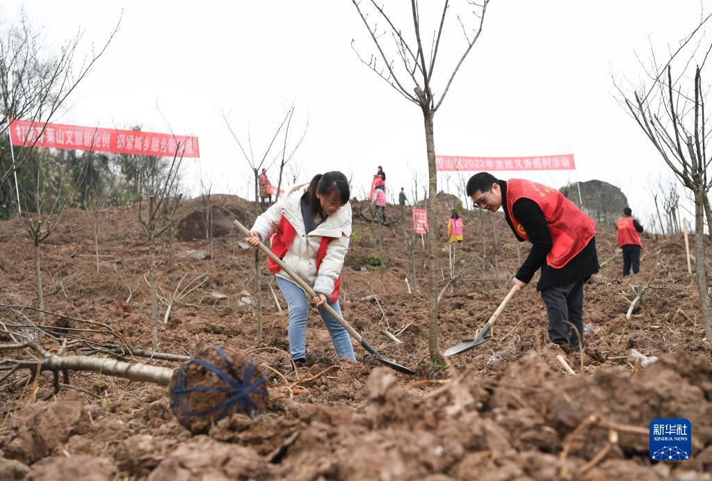 3月1日,在重庆市璧山区,参加义务植树活动的志愿者在植树。新华社记者 王全超 摄