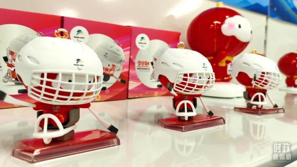 冬奥村特许商品零售店内,冬残奥会吉祥物“雪容融”冰球运动文创产品亮相。(总台央视记者钟锋拍摄)
