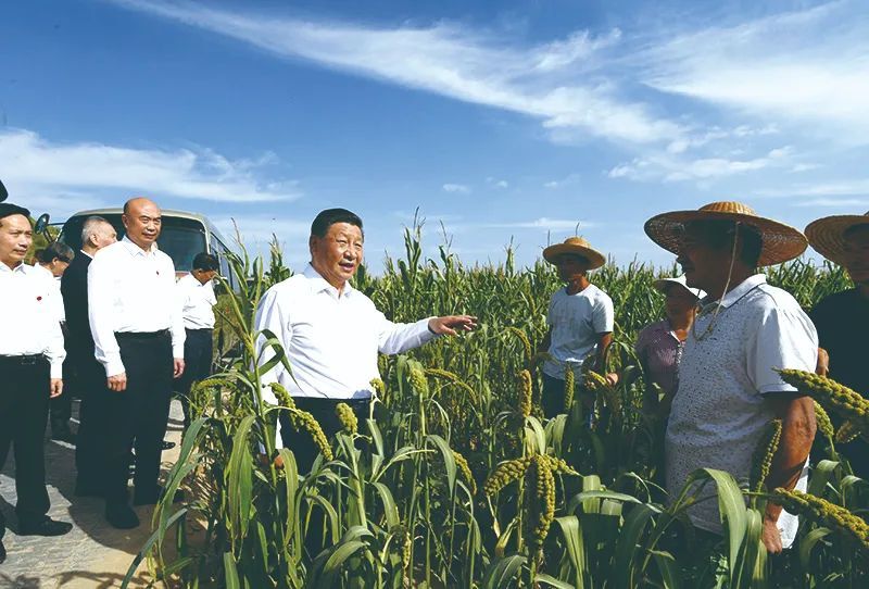 2021年9月13日下午,习近平在陕西榆林市米脂县银州街道高西沟村,察看粮食作物长势,同正在田间劳作的老乡拉家常。新华社记者 李学仁摄