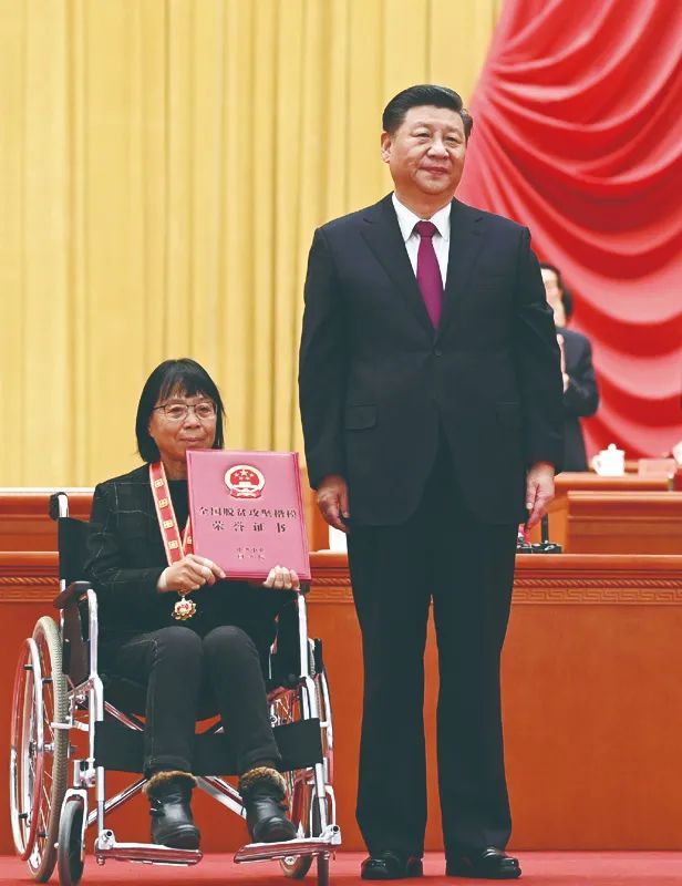 2021年2月25日,全国脱贫攻坚总结表彰大会在北京人民大会堂隆重举行。这是习近平为全国脱贫攻坚楷模荣誉称号获得者张桂梅颁奖。新华社记者 李学仁摄
