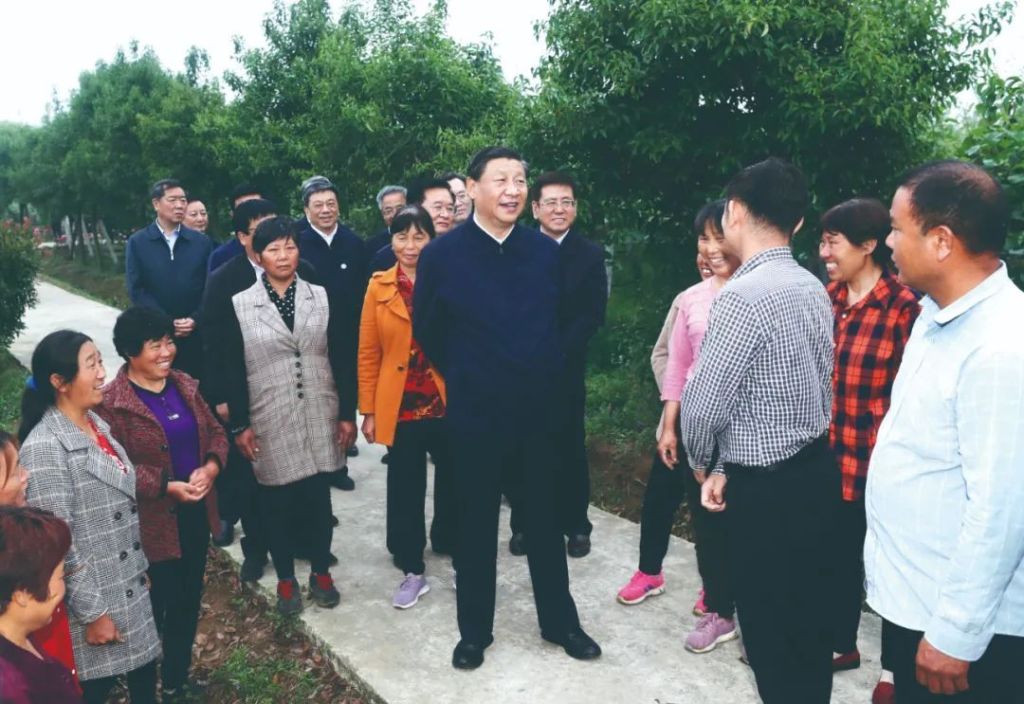 2021年5月13日,习近平在河南南阳市淅川县九重镇邹庄村考察利用南水北调移民村产业发展资金建立起来的丹江绿色果蔬园基地,同村民亲切交流。新华社记者 王晔摄