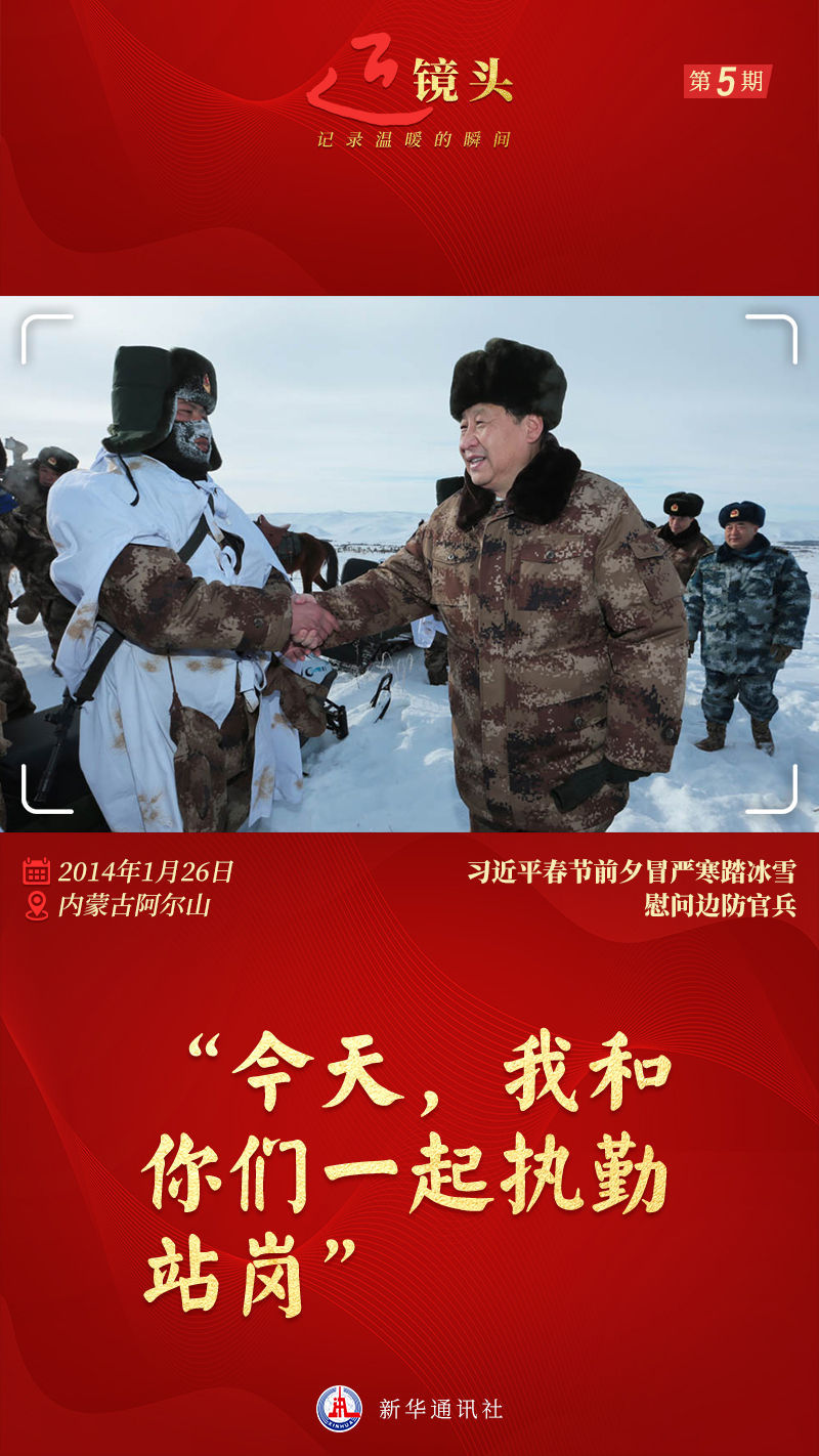 这一幕,被新华社记者用相机定格下来:2014年1月26日上午,习近平主席来到祖国边疆的内蒙古阿尔山,冒着零下30多摄氏度的严寒,迎风踏雪慰问在边防线上巡逻执勤的官兵。