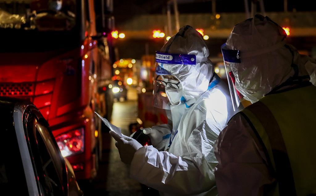 4月23日,江苏省淮安市,疫情防控志愿者在长深高速淮安南出入口,对过往车辆和人员行程信息、健康信息进行查验。