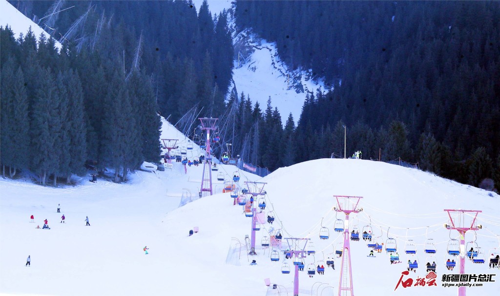 滑雪爱好者与游客在位于乌鲁木齐市的丝绸之路国际度假区滑雪场滑雪休闲(2021年12月26日摄)。(摄影:张秀科)