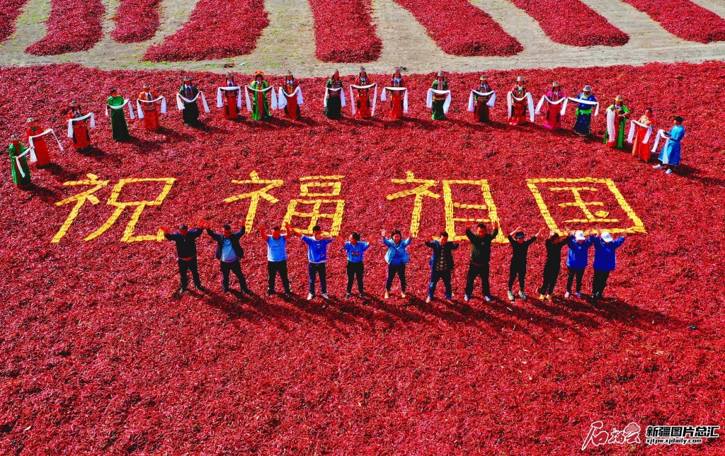 巴音郭楞蒙古自治州博湖县乌兰再格森乡农民用辣椒和玉米摆出“祝福祖国”字样,表达丰收喜悦,祝福祖国繁荣昌盛(2020年10月1日摄)。(摄影:年磊)
