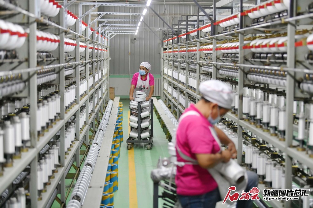 工人在和田地区策勒县新疆欧锦亚纺织有限公司车间工作(2020年9月20日摄)。该公司优先招录当地贫困村民进企业工作,让他们实现稳定就业、持续增收。(摄影:邹懿)