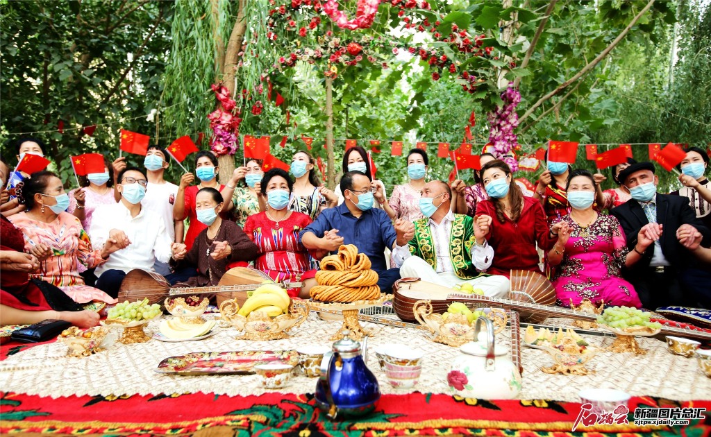 阿克苏地区库车市融媒体中心职工与萨克萨克街道惠民社区居民一起开展“民族团结一家亲”联谊活动(2020年9月27日摄)。(摄影:尼亚孜·热合曼)