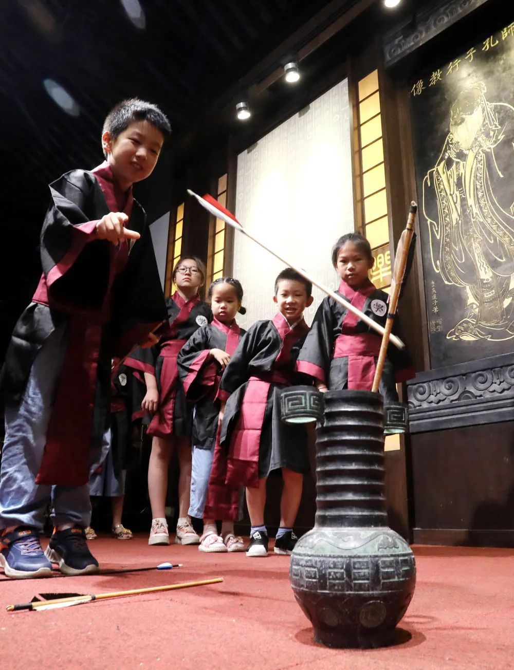 身着古装的小朋友在苏州碑刻博物馆体验投壶游戏。新华社发