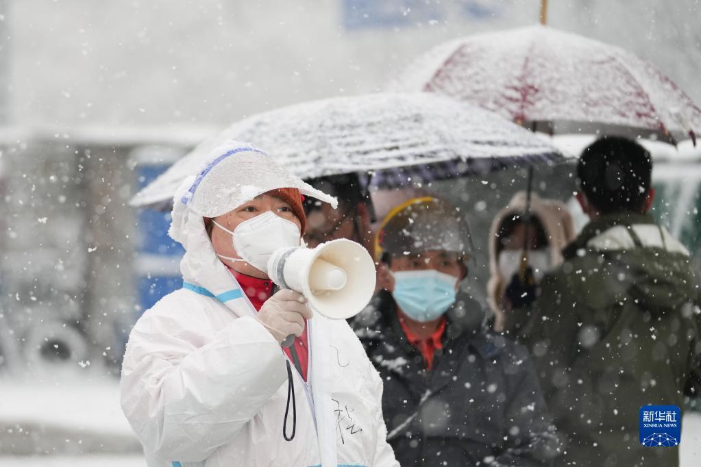 3月18日,在北京市东城区北新桥街道一处核酸采样点,工作人员冒雪引导前来检测的居民。新华社记者 鞠焕宗 摄