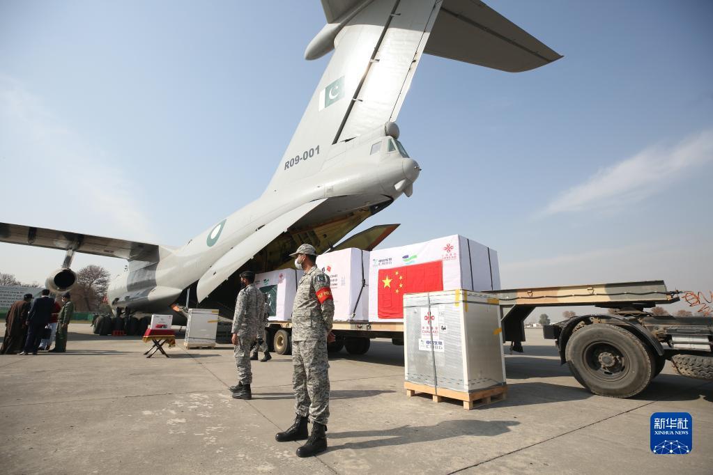 这是2021年2月1日在巴基斯坦首都伊斯兰堡附近的努尔汗空军基地拍摄的中国政府援助新冠疫苗交接仪式现场。新华社记者 刘天 摄