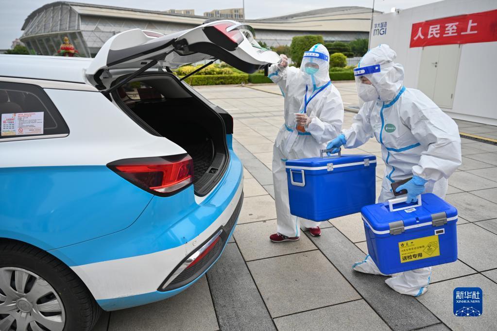 3月24日,在福建泉州市海峡体育中心联合方舱核酸检测基地,参加“抗疫志愿车队”的出租车司机(左)协助医务人员装运核酸检测样本。新华社发(周义 摄)