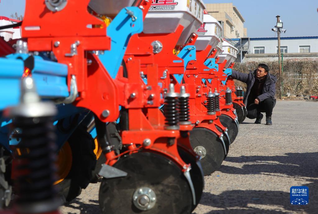 2月23日,在辽宁省铁岭县辽宁实丰机械有限公司,工人检查即将出厂的玉米播种机。新华社记者 杨青 摄