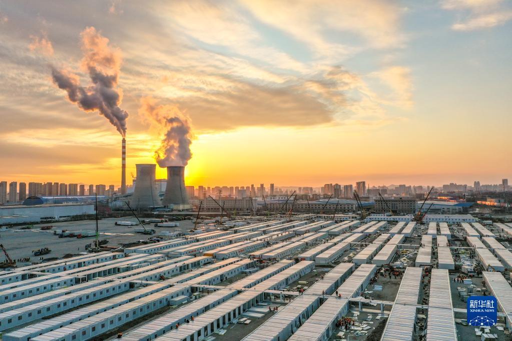 这是3月20日傍晚拍摄的吉林市高新南区隔离方舱建设现场(无人机照片)。新华社记者 张楠 摄