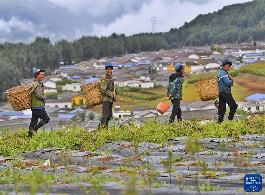 四川省凉山彝族自治州布拖县拖觉镇老吉村的妇女在去往蓝莓种植基地务工的路上(2020年8月13日摄)。 新华社记者 刘坤 摄