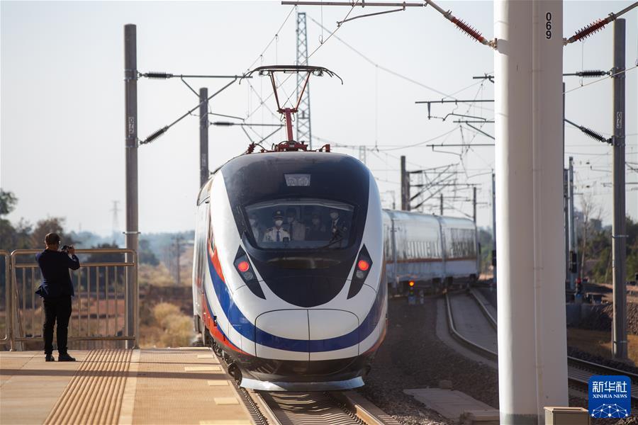 “澜沧号”动车组列车驶离老挝万象站(2021年12月3日摄)。 新华社发(凯乔摄)