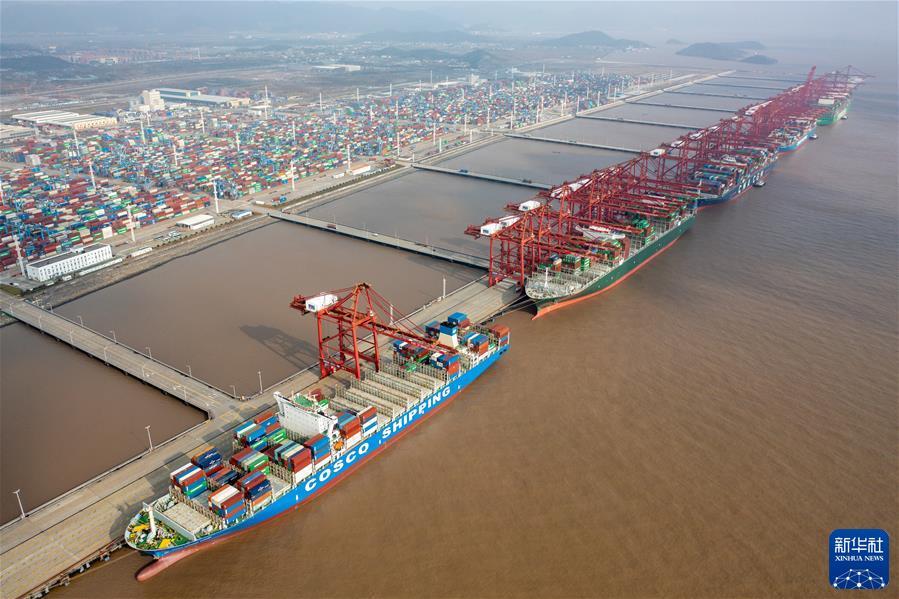 浙江宁波舟山港梅山港区集装箱码头一派繁忙(2021年12月17日摄,无人机照片)。 新华社发(蒋晓东 摄)