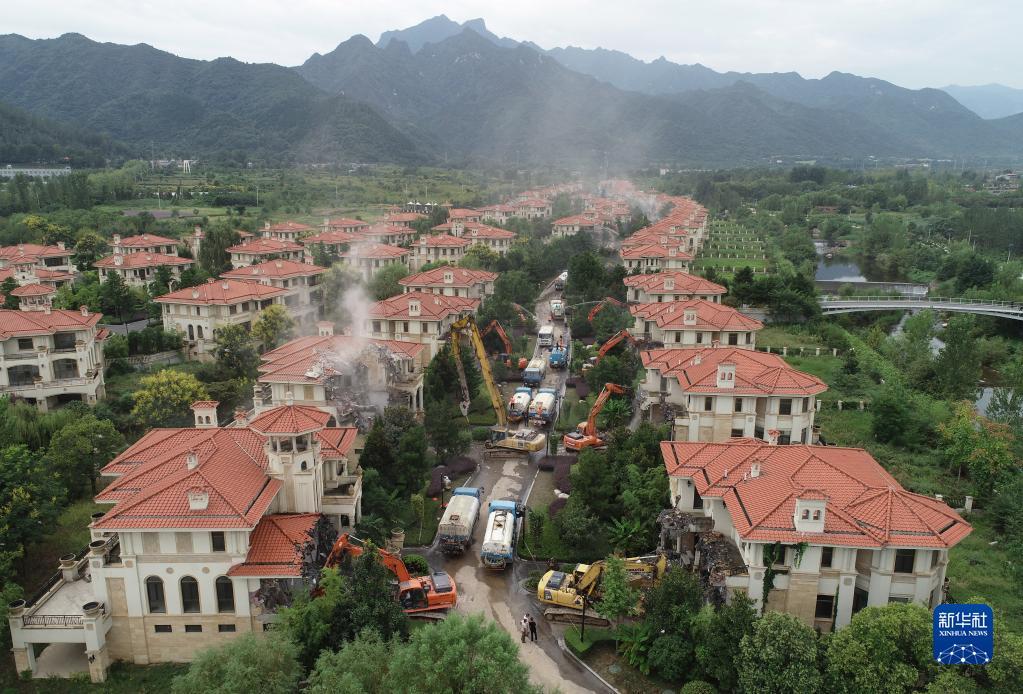 大型机械在陕西省西安市长安区秦岭违建别墅群“群贤别业”内进行拆除工作(2018年9月6日摄,无人机照片)。新华社记者 邵瑞 摄