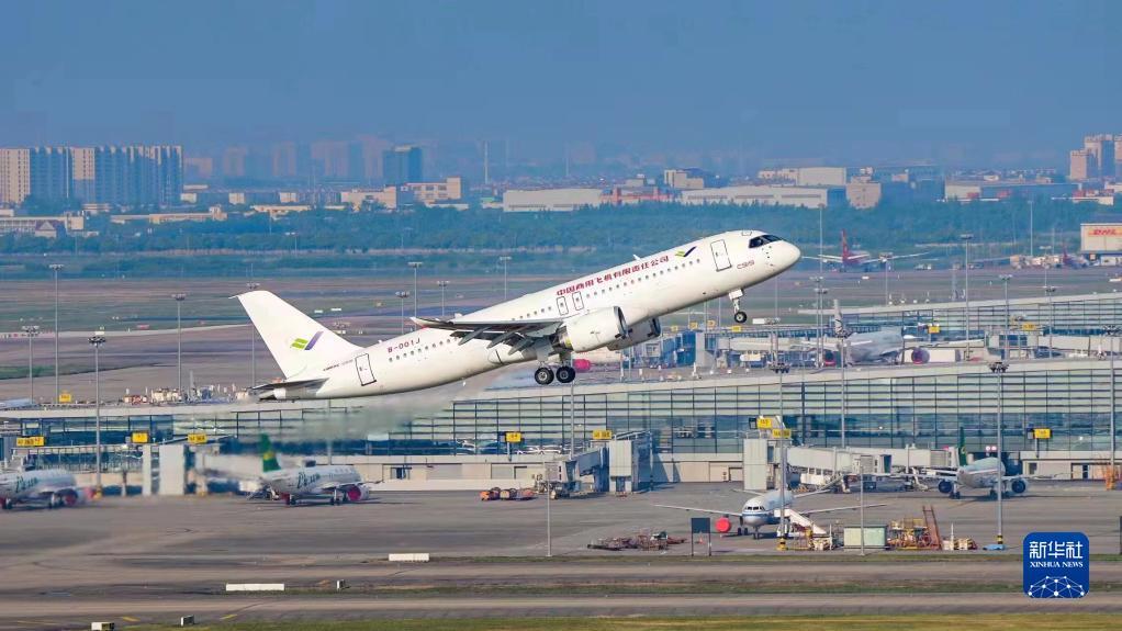5月14日6时52分,编号为B-001J的C919大飞机从上海浦东机场第4跑道起飞,于9时54分安全降落,标志着中国商飞公司即将交付首家用户的首架C919大飞机首次飞行试验圆满完成。新华社发