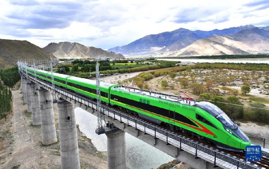 这是试运行的复兴号列车行驶在西藏山南市境内(6月16日摄)。6月25日,全长435公里、设计时速160公里的拉林铁路建成通车,西藏首条电气化铁路建成,同时复兴号实现对31个省区市全覆盖。新华社记者 觉果 摄