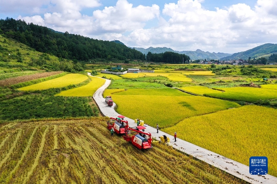 2021年9月15日,贵州省龙里县湾滩河镇羊场社区的农民在抢收稻谷(无人机照片)。新华社记者 杨文斌 摄