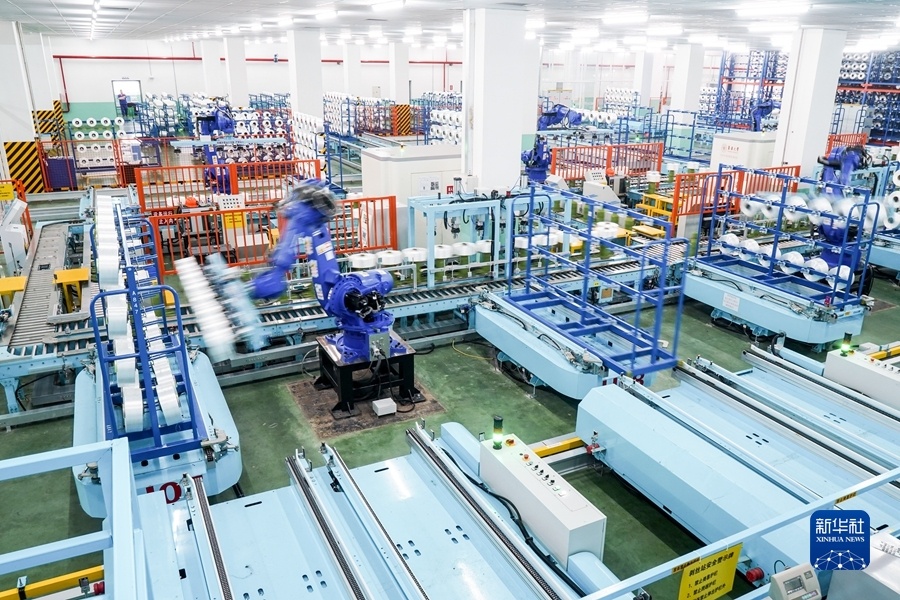 2021年5月14日,在位于江苏省苏州市吴江区盛泽镇的一家智能车间,机器人在车间内自动作业。新华社记者 李博 摄
