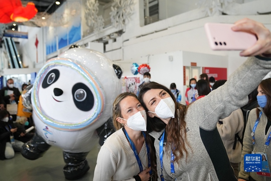 2月12日,北京冬奥会主媒体中心举办集体采访活动,现场观众与北京2022年冬奥会吉祥物“冰墩墩”自拍留念。新华社记者 鞠焕宗 摄