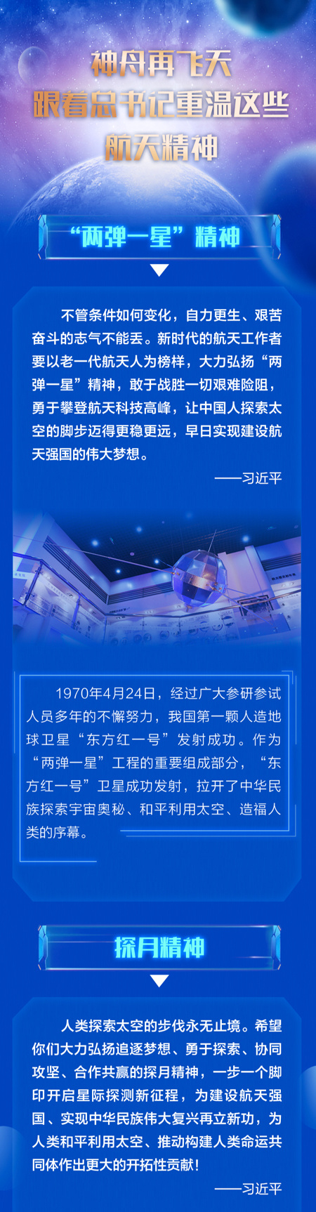 “探索浩瀚宇宙,发展航天事业,建设航天强国,是我们不懈追求的航天梦。”经过几代航天人的接续奋斗,我国航天事业已经创造了以“两弹一星”、载人航天、月球探测为代表的辉煌成就,走出了一条自力更生、自主创新的发展道路,积淀了深厚博大的航天精神。
