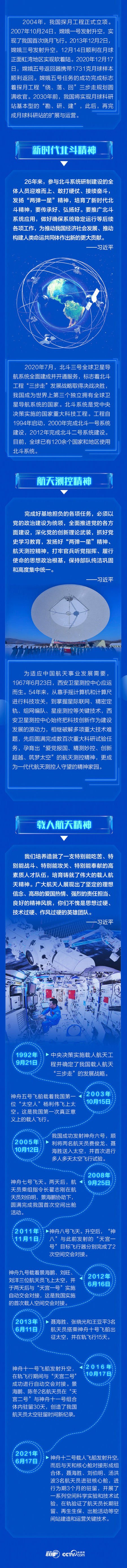 “两弹一星”精神、探月精神、新时代北斗精神、载人航天精神、航天测控精神……在不同场合,习近平总书记频频提及这些精神,为中国航天人点赞。