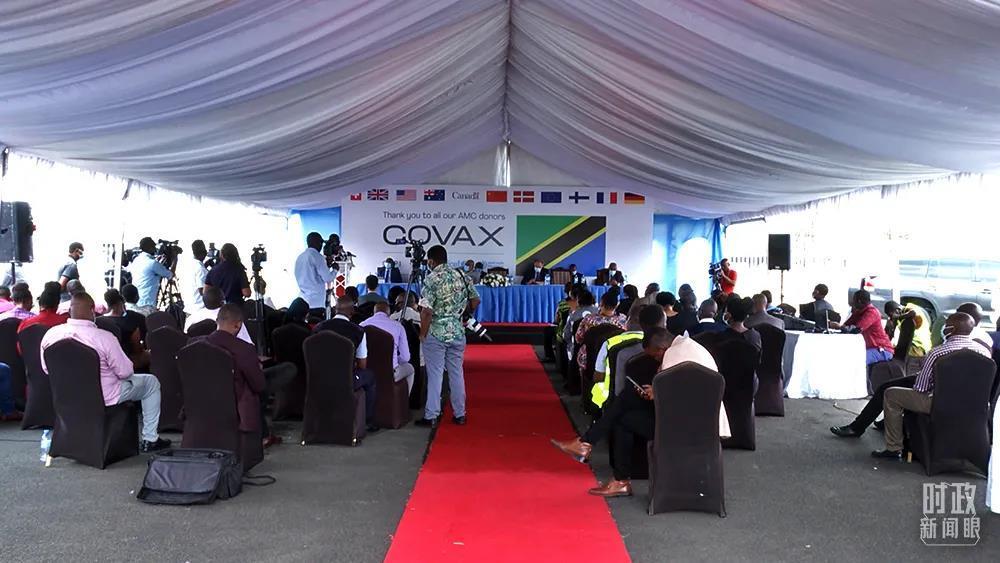2021年10月8日,中国政府通过“新冠疫苗实施计划”捐赠的新冠疫苗运抵坦桑尼亚。当地政府在机场举行隆重的欢迎仪式。(中央广播电视总台记者史跃拍摄)
