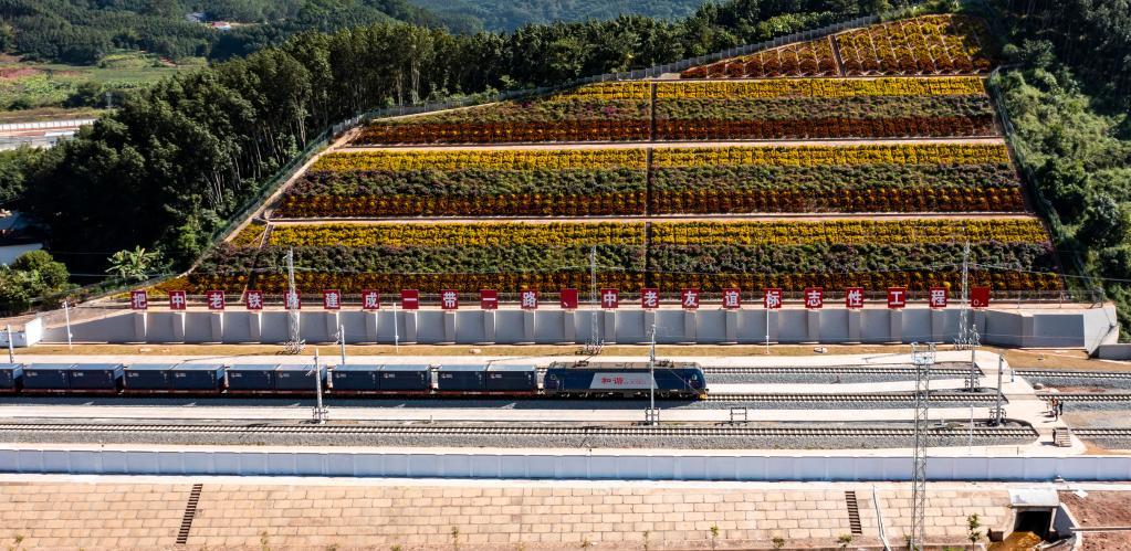 2021年12月4日,中老铁路首趟国际货物列车经磨憨铁路口岸前往老挝。图为货物列车即将驶入位于中老边境的友谊隧道(无人机照片)。新华社记者 江文耀 摄