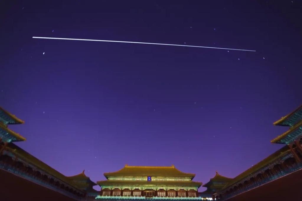 2021年11月19日,在北京故宫午门拍摄的中国空间站过境照片(轨迹为多张照片堆栈)。新华社记者 邢广利 摄