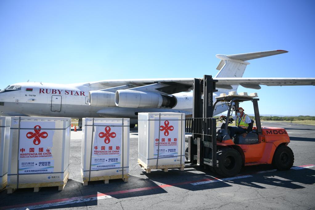2021年12月24日,中国政府提供的第二批新冠疫苗运抵尼加拉瓜,助力当地开展疫苗接种计划。图为当日在尼加拉瓜马那瓜国际机场,工作人员转运由中国国药集团生产的新冠疫苗。新华社记者 辛悦卫 摄