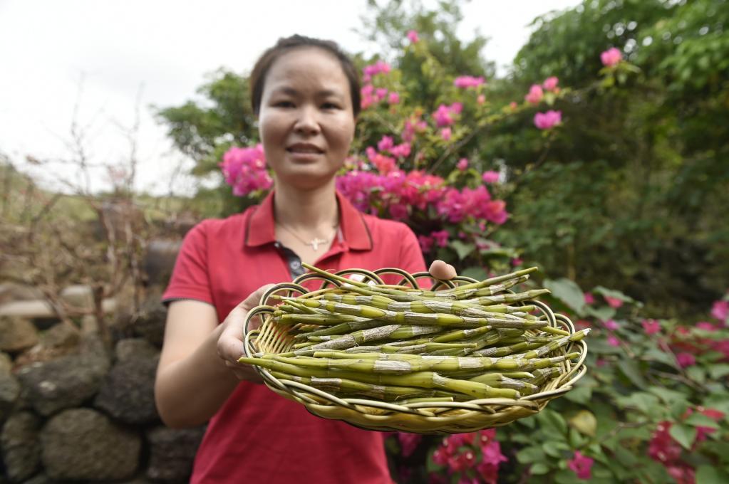 2019年3月14日,海南海口市秀英区石山镇施茶村村民展示新鲜的石斛。新华社记者 鲁鹏 摄