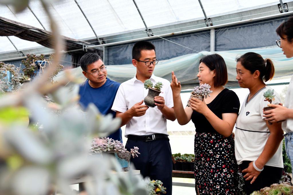 2020年6月9日,在山东省济南市章丘区三涧溪村农业创业园,青年创业党支部书记王元虎(左二)和青年党员一起商量发展事宜。新华社记者 王凯 摄