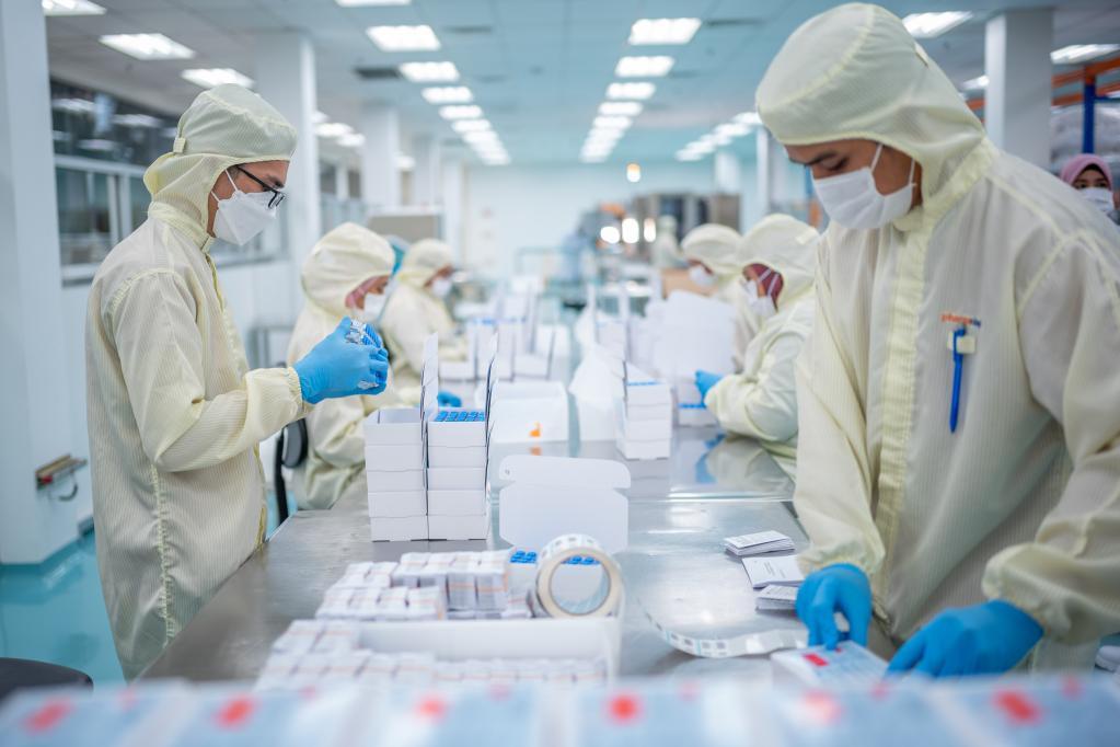 2021年10月5日,在马来西亚吉隆坡郊区的发马公司灌装工厂,工人在包装本地灌装生产的科兴疫苗。