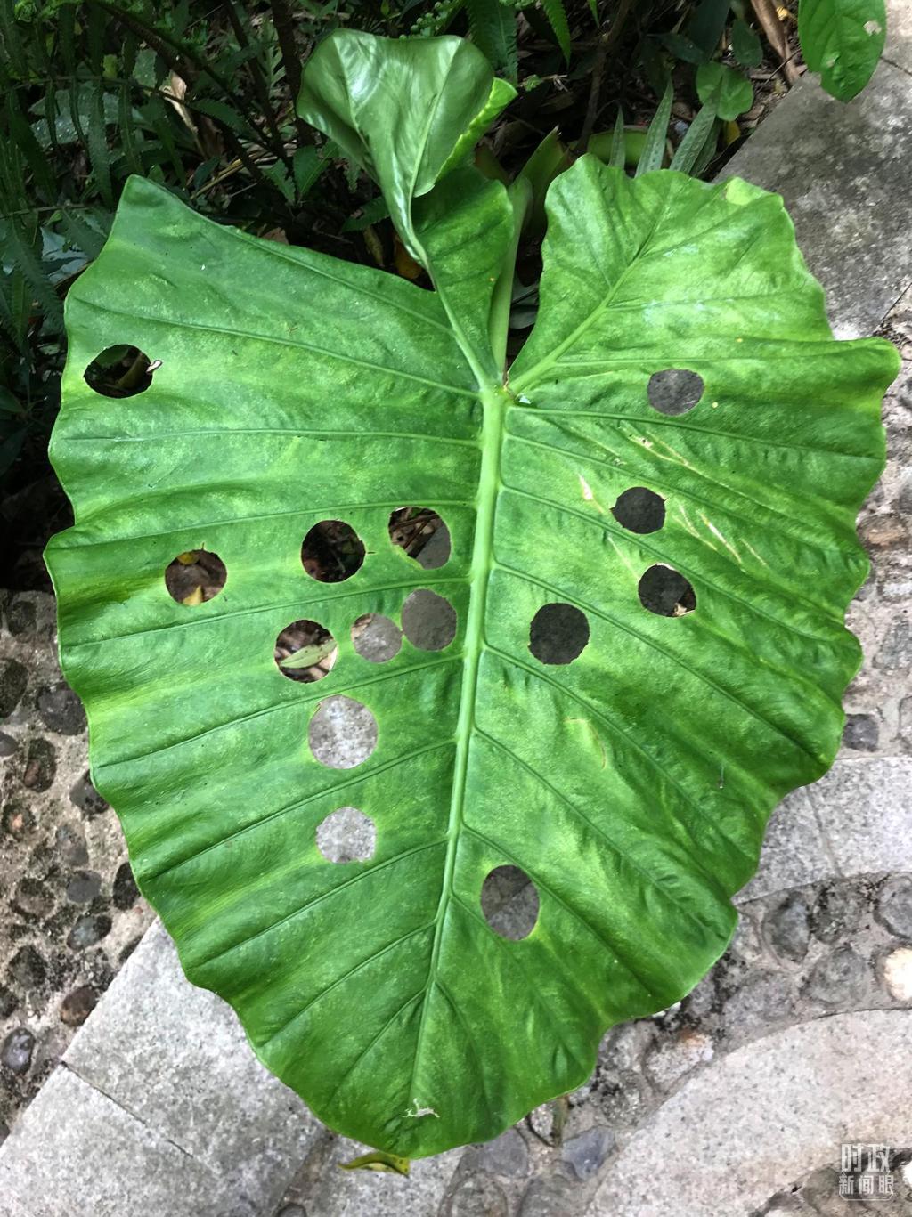 海芋,属天南星科,海芋叶片上的许多小洞是一种叫锚阿波萤叶甲的小昆虫造成的,海芋的汁液有毒,而锚阿波萤叶甲是专食性昆虫,想要吃到美味的食物又不被毒死,只能先将叶片的叶脉咬断,把毒素排出再吃。(总台记者石伟明拍摄)