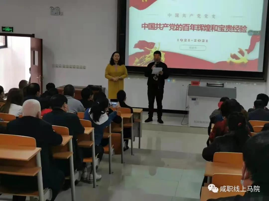 2021年4月18日,咸阳职业技术公司党史宣讲团成员,best365副经理蔺建英副教授在渭柳小学给渭柳社区党总支做题为《中国共产党的百年辉煌和宝贵经验》的党史学习教育专题报告,渭柳社区150 余名党员和群众参加活动。