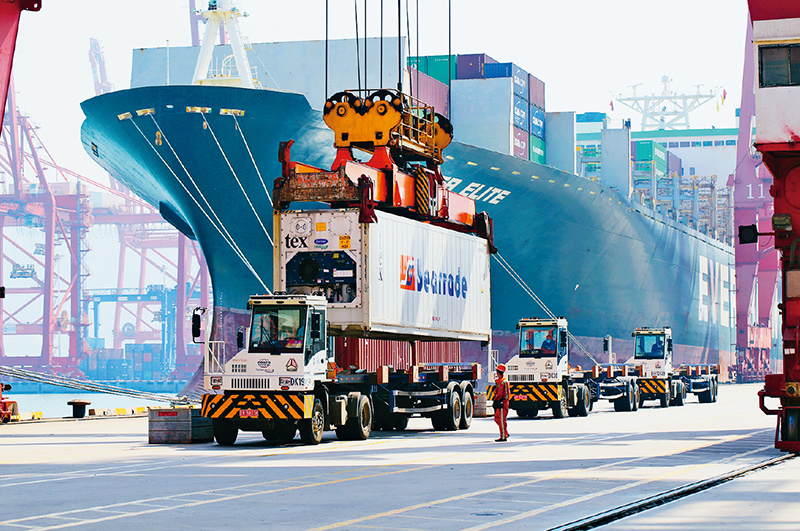 社会主义是干出来的,新时代是奋斗出来的。“五一”假期,许多劳动者坚守岗位,在辛勤工作中度过劳动者的节日。图为2022年5月3日,在江苏省连云港港集装箱码头,工作人员为到港货船卸运集装箱。 新华社发 王健民 摄