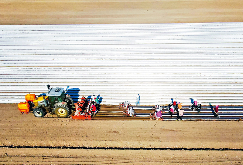 耕地是粮食生产的命根子。近年来,各地持续推进农田水利设施和高标准农田建设,加快良种、先进农机装备攻关和推广应用,不断提高农业综合生产能力,促进农民致富增收。图为2022年4月29日,工作人员在国家现代农业示范区——河北省张家口市塞北管理区农业基地播种胡萝卜。 新华社发 武殿森 摄