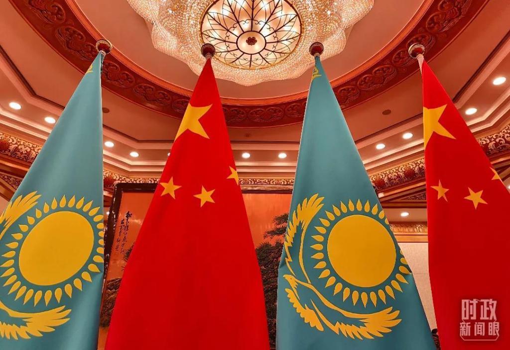 2月5日上午,会谈现场摆放的中哈两国国旗。(总台央视记者杨立峰拍摄)