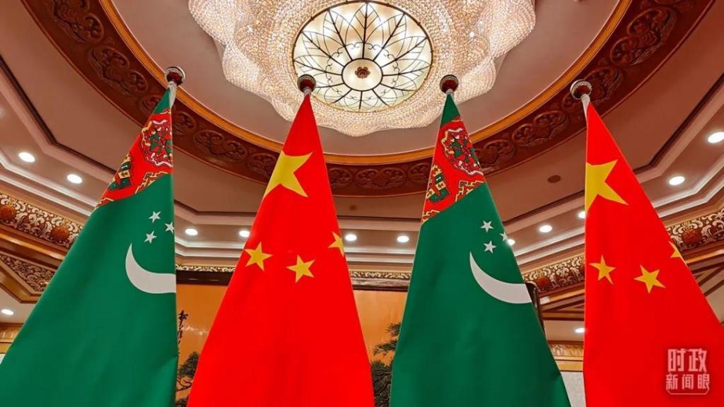 土库曼斯坦国旗与五星红旗。(总台央视记者杨立峰拍摄)